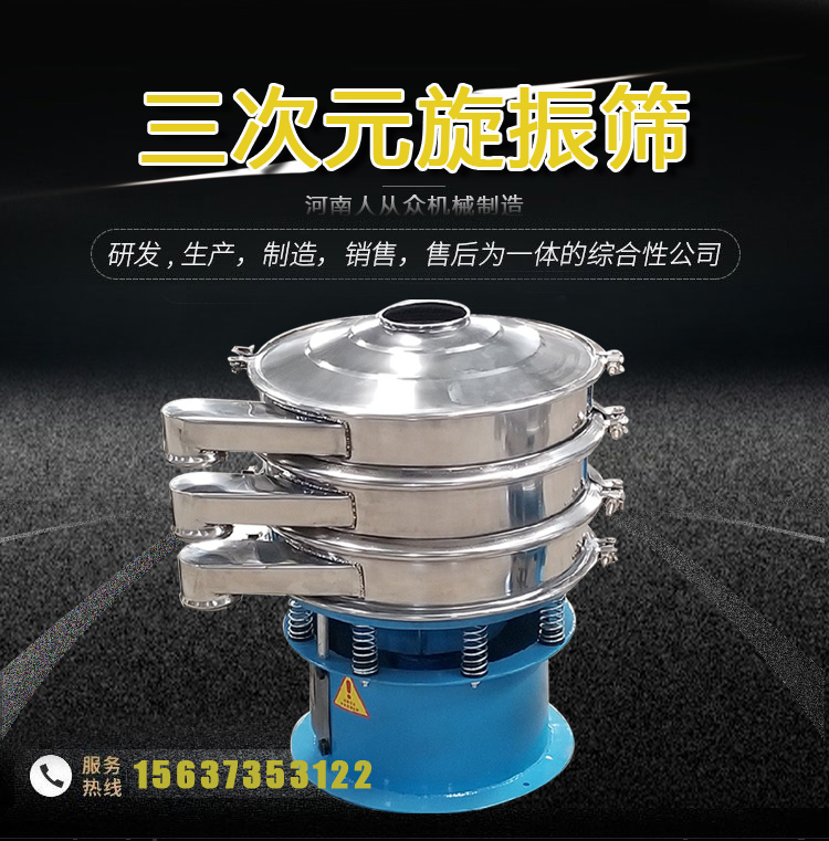 三次元旋振篩,我們可以從字面了解到它的運(yùn)動(dòng)軌跡是三維立體的,它使用直立式電機(jī)作為激振源,在電機(jī)的上端和下端安裝偏心塊,將電機(jī)的旋轉(zhuǎn)運(yùn)動(dòng)轉(zhuǎn)換為水平、垂直和傾斜的三維運(yùn)動(dòng),然后將該運(yùn)動(dòng)傳輸?shù)胶Y面,使物料在篩面上做外擴(kuò)漸開(kāi)線運(yùn)動(dòng),故該系列振動(dòng)篩稱之為旋振動(dòng)篩。